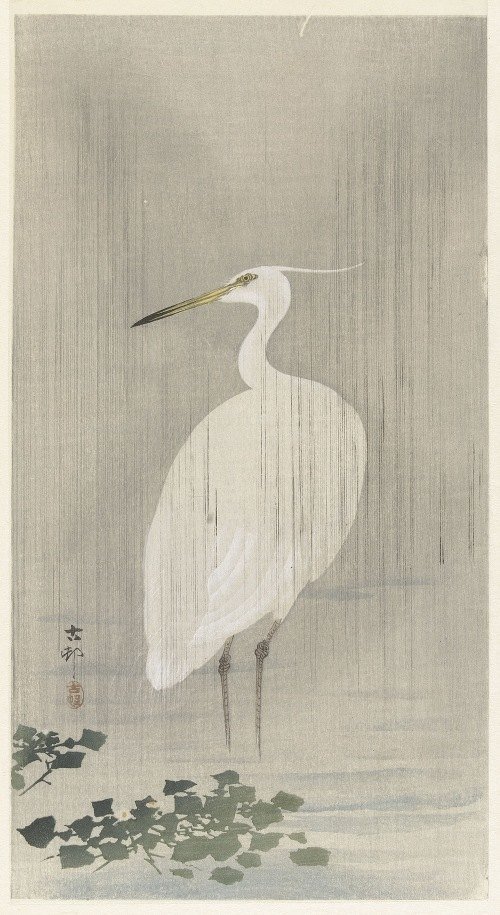 Descripción de la obra: Egret in Rain es una delicada xilografía del artista japonés Ohara Koson, representante del movimiento shin-hanga, que revitalizó el arte tradicional del grabado japonés a comienzos del siglo XX. La obra muestra una garza blanca bajo la lluvia, símbolo de pureza, gracia y longevidad en la cultura japonesa. Con su refinada técnica de impresión en madera, Koson logra transmitir la serenidad del instante y la armonía entre el arte y la naturaleza.