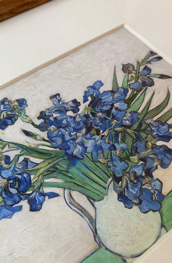 Van Gogh pintó esta obra en 1889, durante su estadía en el asilo de Saint-Rémy. El iris, flor cargada de simbolismo, se convierte en protagonista absoluto gracias a la pincelada enérgica y los tonos intensos de azul y verde. La composición transmite frescura y vitalidad, con ese movimiento característico que hace de cada obra de Vincent una experiencia vibrante y emotiva.